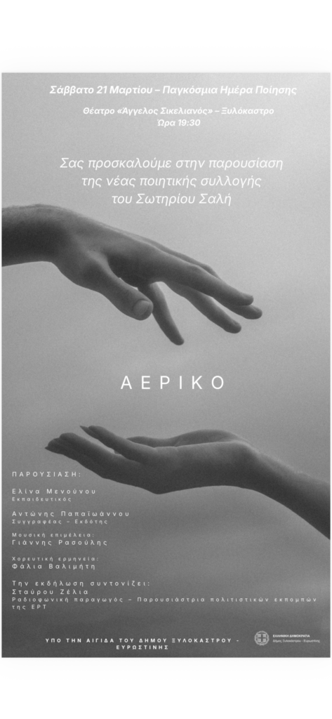 Με αφορμή την Παγκόσμια Ημέρα Ποίησης, το Σάββατο 21 Μαρτίου (19:30), στο Θέατρο «Άγγελος Σικελιανός» στο Ξυλόκαστρο και υπό την αιγίδα του Δήμου, παρουσιάζεται στο κοινό η νέα ποιητική συλλογή του Σωτήρη Σαλή με τίτλο «Αερικό».