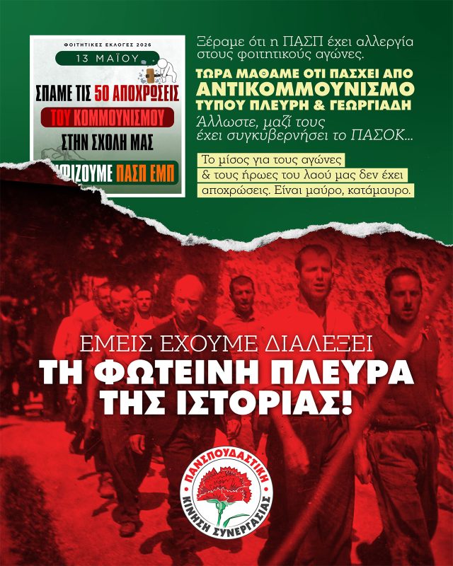 Με μια ανιστόρητη αφίσα και το σύνθημα «Σπάμε τα 50 χρώματα του κομμουνισμού στη σχολή μας», η φοιτητική παράταξη του ΠΑΣΟΚ (ΠΑΣΠ ΕΜΠ), ευθυγραμμιζόμενη πλήρως με ακροδεξιές αντιλήψεις τύπου Πλεύρη και Γεωργιάδη, επιδόθηκε σε ένα καταπτυστό αντικομμουνιστικό παραλήρημα ενόψει των φοιτητικών εκλογών, το οποίο προκαλεί πολιτική δυσοσμία σε κάθε δημοκρατικό πολίτη αυτής της χώρας.