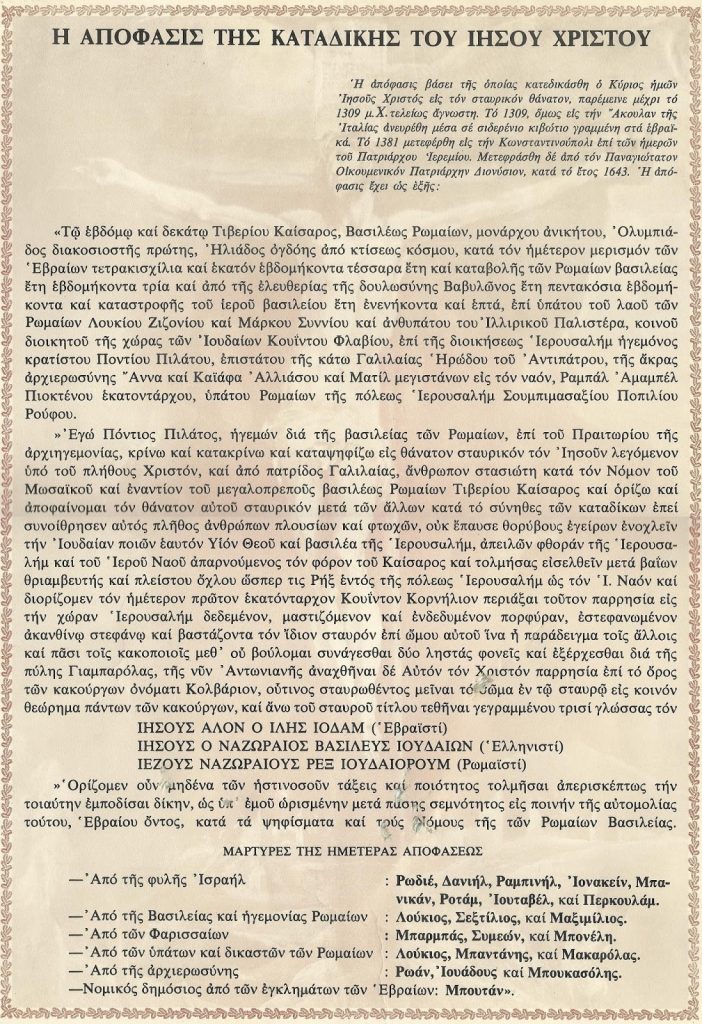 Μια δίκη η οποία δεν έγινε σύμφωνα με τον νόμο και την δικονομία και η οποία δεν κατέληξε σε ετυμηγορία είναι συνεχώς σε κατάσταση συνεχούς κρίσης. Αυτή την κρίση έρχεται να καλύψει το παρόν έγγραφο της απόφασης της καταδίκης του Ιησού Χριστού το οποίο δημιουργεί πολλούς προβληματισμούς και αμφισβητήσεις και δεν παρέχει τη βεβαιότητα του εγκύρου.