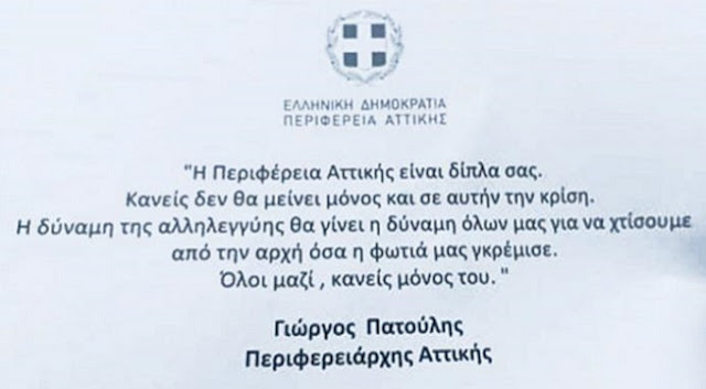 Σύμφωνα με τις καταγγελίες κατοίκων του Δήμου Μάνδρας – Ειδυλλίας, ο Περιφερειάρχης τοποθέτησε μέσα στις μερίδες του φαγητού το παραπάνω εικονιζόμενο μήνυμα. Πάντα με υπογραφή στο τέλος. Με ονοματεπώνυμο για να θυμόμαστε. Να …θυμόμαστε πως ο κ. Πατούλης, μέλος του «επιτελικού κράτους» Μητσοτάκη, μοίρασε συσσίτιο στους πυρόπληκτους μιας περιοχής που …έκαψε η πολιτική που υπηρετεί ο ίδιος και αφήνουν «γυμνούς» τους μηχανισμούς πυρόσβεσης και πυροπροστασίας.