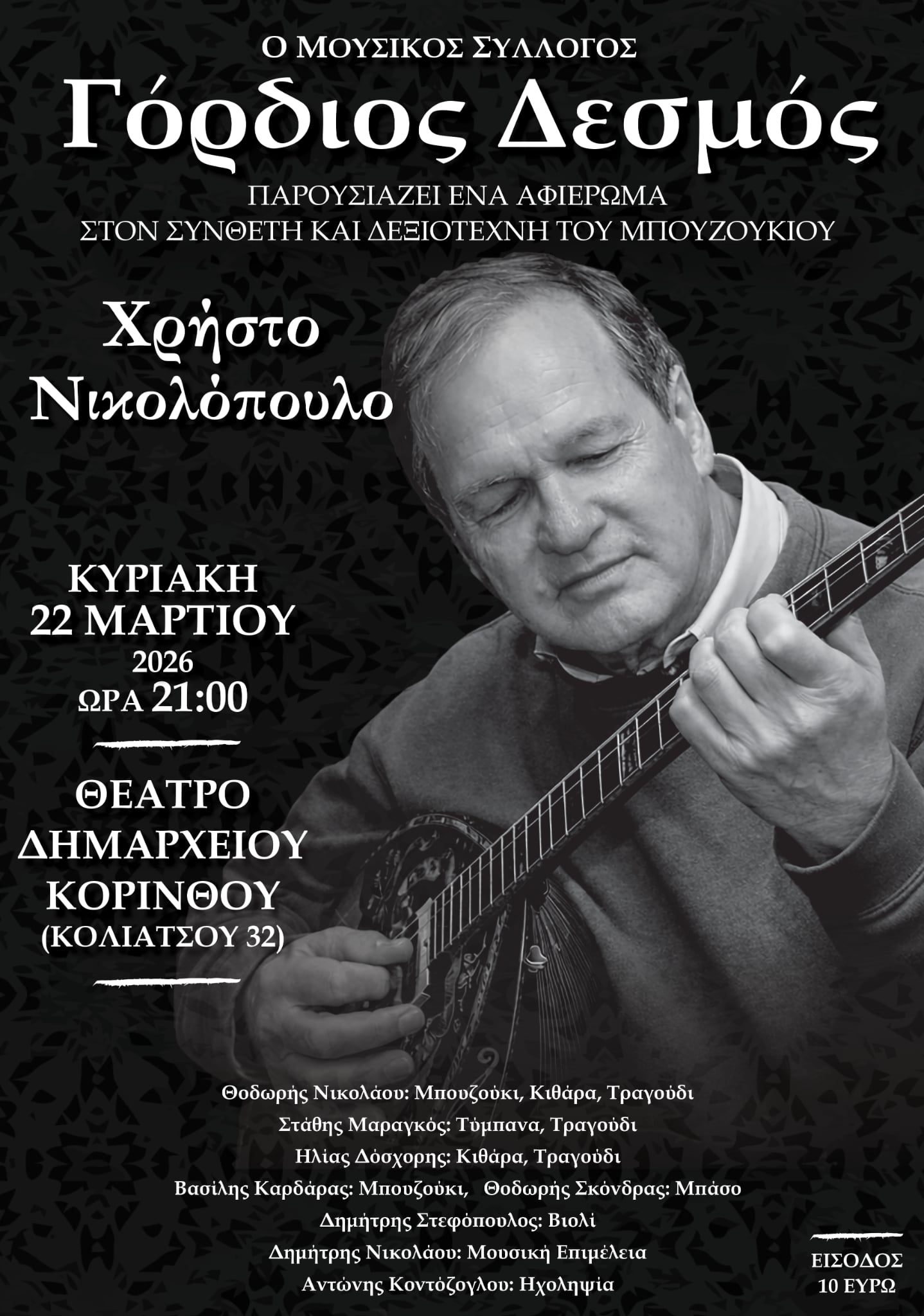 Ένα μουσικό ταξίδι στις μεγάλες στιγμές του ελληνικού τραγουδιού ετοιμάζει το σχήμα «Γόρδιος Δεσμός», για την Κυριακή 22 Μαρτίου, στο θεατράκι του Δημαρχείου Κορίνθου, παρουσιάζοντας ένα μοναδικό αφιέρωμα στον κορυφαίο συνθέτη Χρήστο Νικολόπουλο.